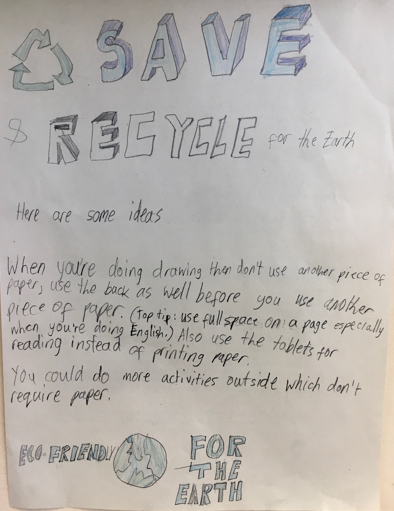 Following their previous year's learning about deforestation, a Year 5 class chose a group goal of reducing paper wastage in school. They wrote to every class in the school with ideas of how to use less paper, as well as making sure that every class uses whole pages to minimise wasted space, changing the way exercise books were used in school. Here is an example of one of their letters: