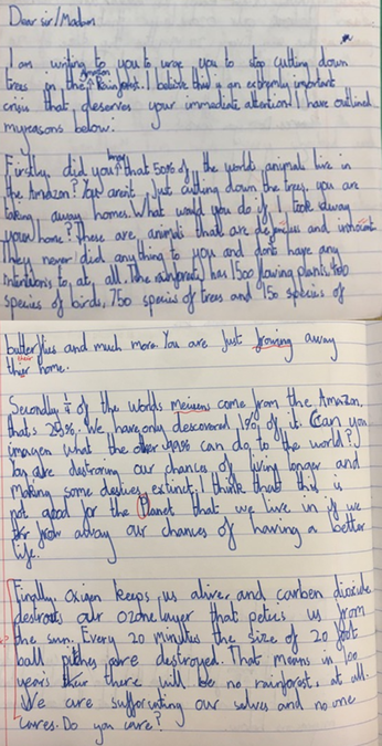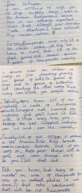 Inspired by their learning about rainforests, Year 4 wrote persuasive letters to discourage deforestation of the Amazon Rainforest: